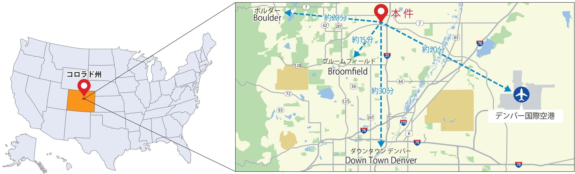 開発地はデンバー市中心部から北に約30㎞、ボルダー市中心部から東に約20㎞のブルームフィールド市。安定した雇用環境で人口増加が進むデンバー市に近く、全米でも住宅価格が高いボルダー市と比較し住宅価格が手頃なため、住宅需要が見込めます。本物件はコロラド大学や有名企業のオフィスが集積する拠点からも近く、教育や雇用面での理想的なエリアです。またテクノロジー、医療、金融関連企業が集積したブルームフィールド市中心部まで車で15分、デンバー中心部まで30分、デンバー国際空港まで20分と比較的近く、幹線道路にも近接しており高い交通利便性も特徴です。