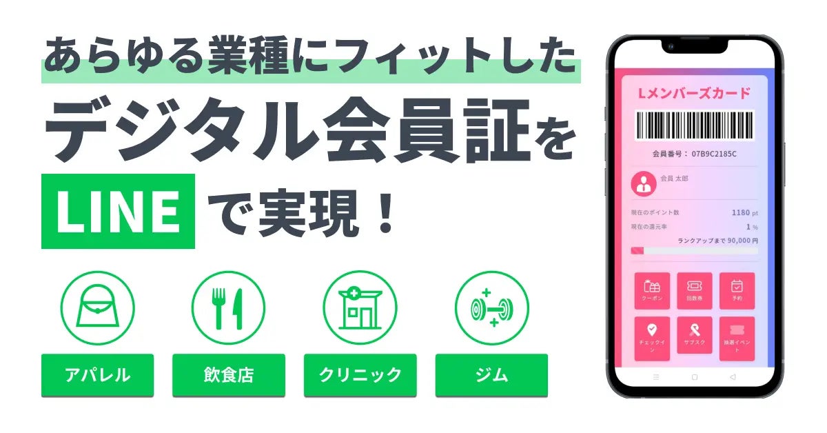 Lメンバーズカードは、LINE上で完結し、多くの業種に対応して自由に拡張機能をカスタマイズできるデジタル会員証サービスです。Lメンバーズカードを店舗や企業に導入することで、スマホアプリのインストールや面倒なログイン作業が不要で、LINEさえあればすぐに会員証・ポイントカードの提示が可能です。