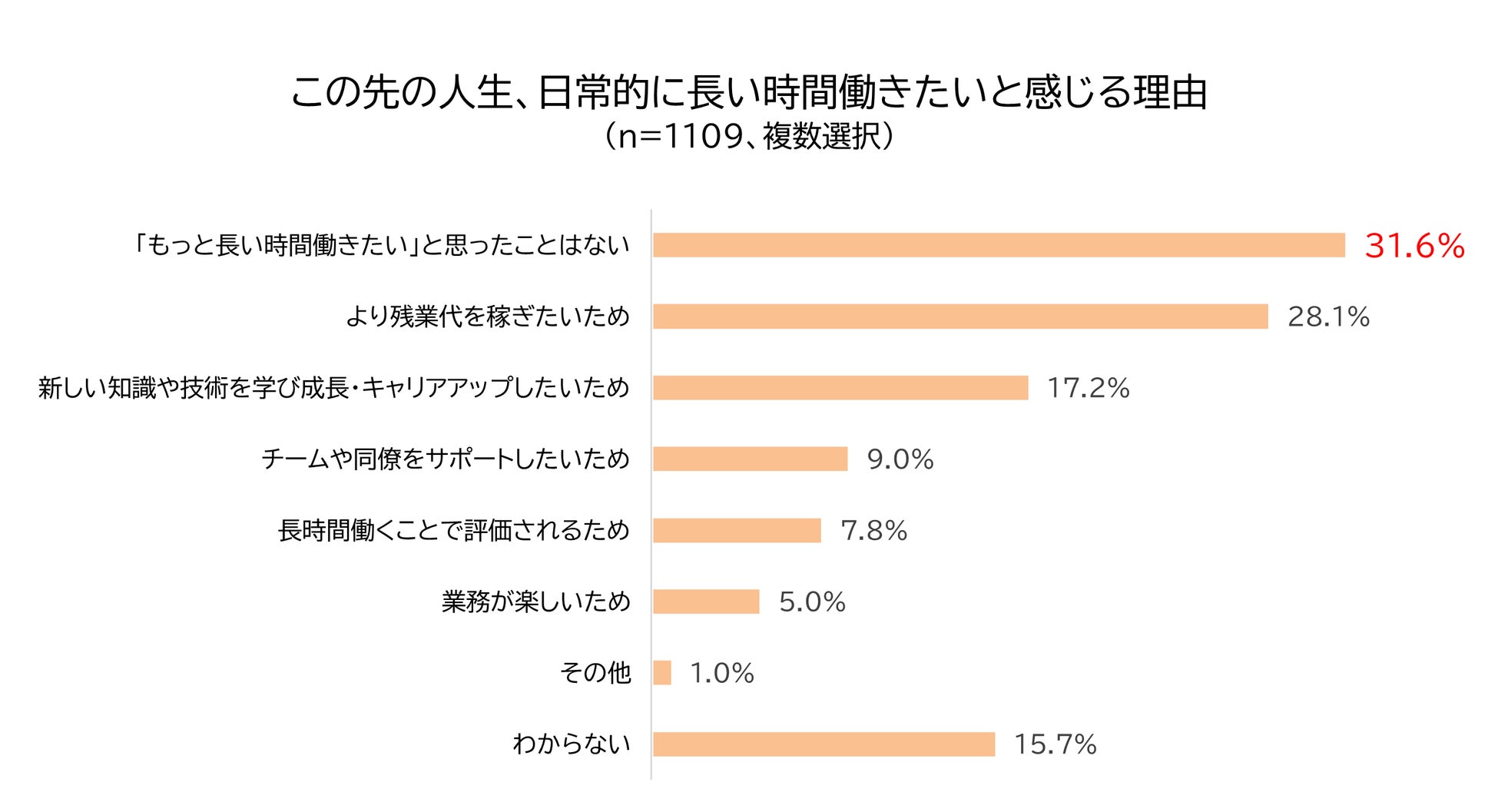 「この先の人生、日常的により長い時間働きたいとしたらその理由は何か」という問いに、「もっと長い時間働きたいと思ったことはない」と回答した人が31.6%と最も多い結果となりました。「残業したい」「長時間働きたいという希望があると聞いている」といった声が耳に入りやすいですが、実際には、今よりも長い時間で日常的に働くことを希望する人は少ないことが明らかとなりました。