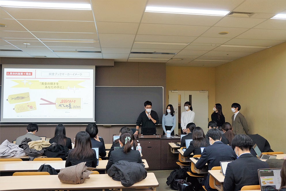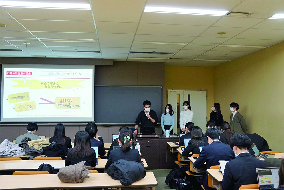 4回目となる2022年は、11月にキックオフ。明治大学商学部菊池一夫ゼミナール3年生と同志社大学商学部上田雅弘ゼミナール3年生に向けマルトモ常務取締役マーケティング本部長の土居幹治が「かつお節とだし」に関する特別講義とオリエンテーションを実施。2022年のテーマは「マルトモ商品を購入したくなるマーケ施策」のほか3課題。12月16日、テーマに則ったマーケティング施策について両大学がコンペ形式で共同研究報告会を開催しました。Z世代の新たな発想で企画された施策案はどれも素晴らしく、今後のマーケティング施策に取り入れていく予定です。