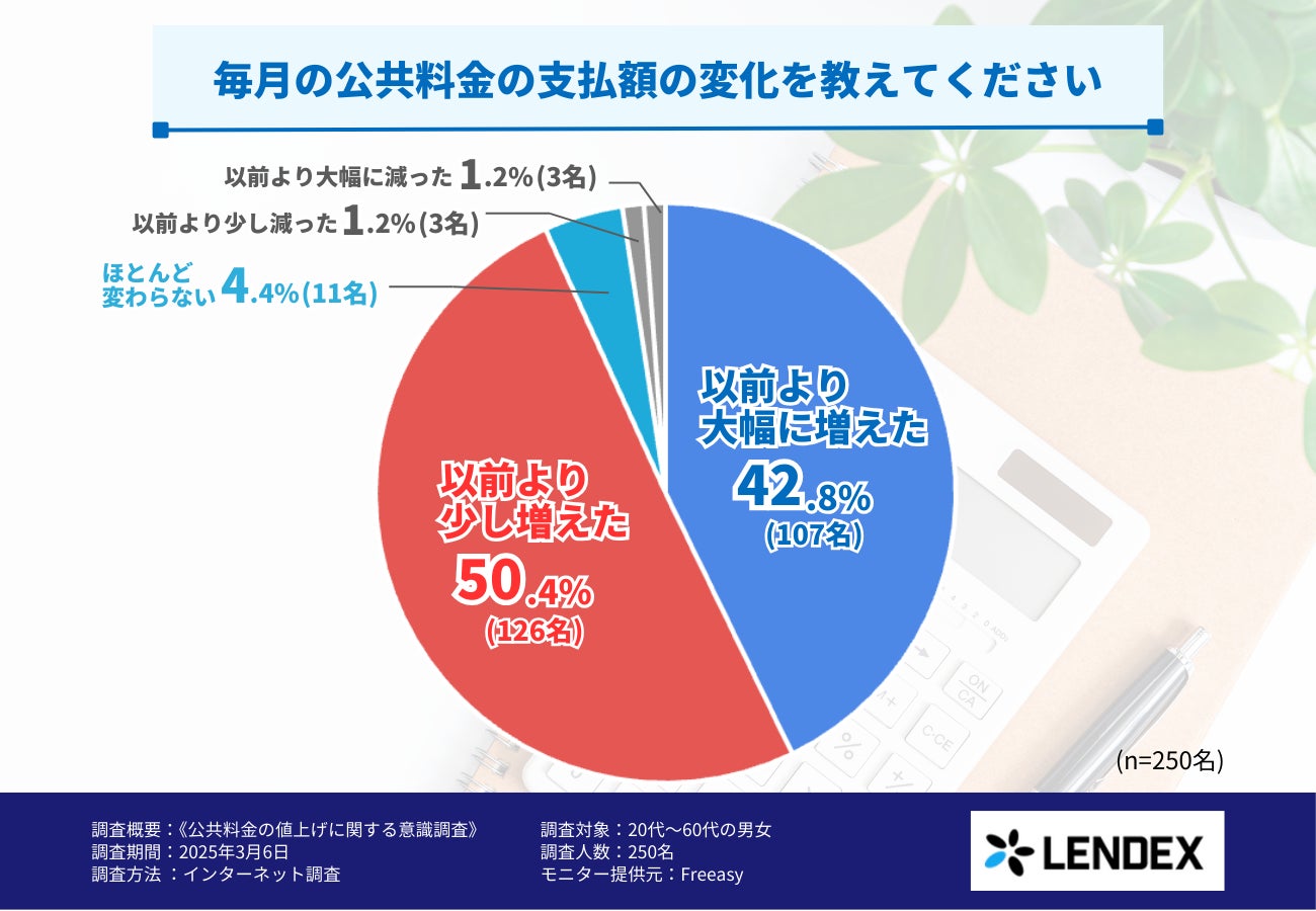 毎月の公共料金について、93.2%が「以前より増えた」と回答されました。内訳を見ると、「少し増えた」が50.4%、「大幅に増えた」が42.8%と、多くの人が支出の増加を感じているようです。