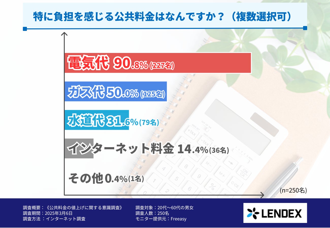 今回の調査で、9割以上が公共料金の値上げを実感していることが明らかになりました。特に「電気代の負担が大きい」との回答が90.8%にのぼり、ガス代や水道代も家計を圧迫していることが分かりました。