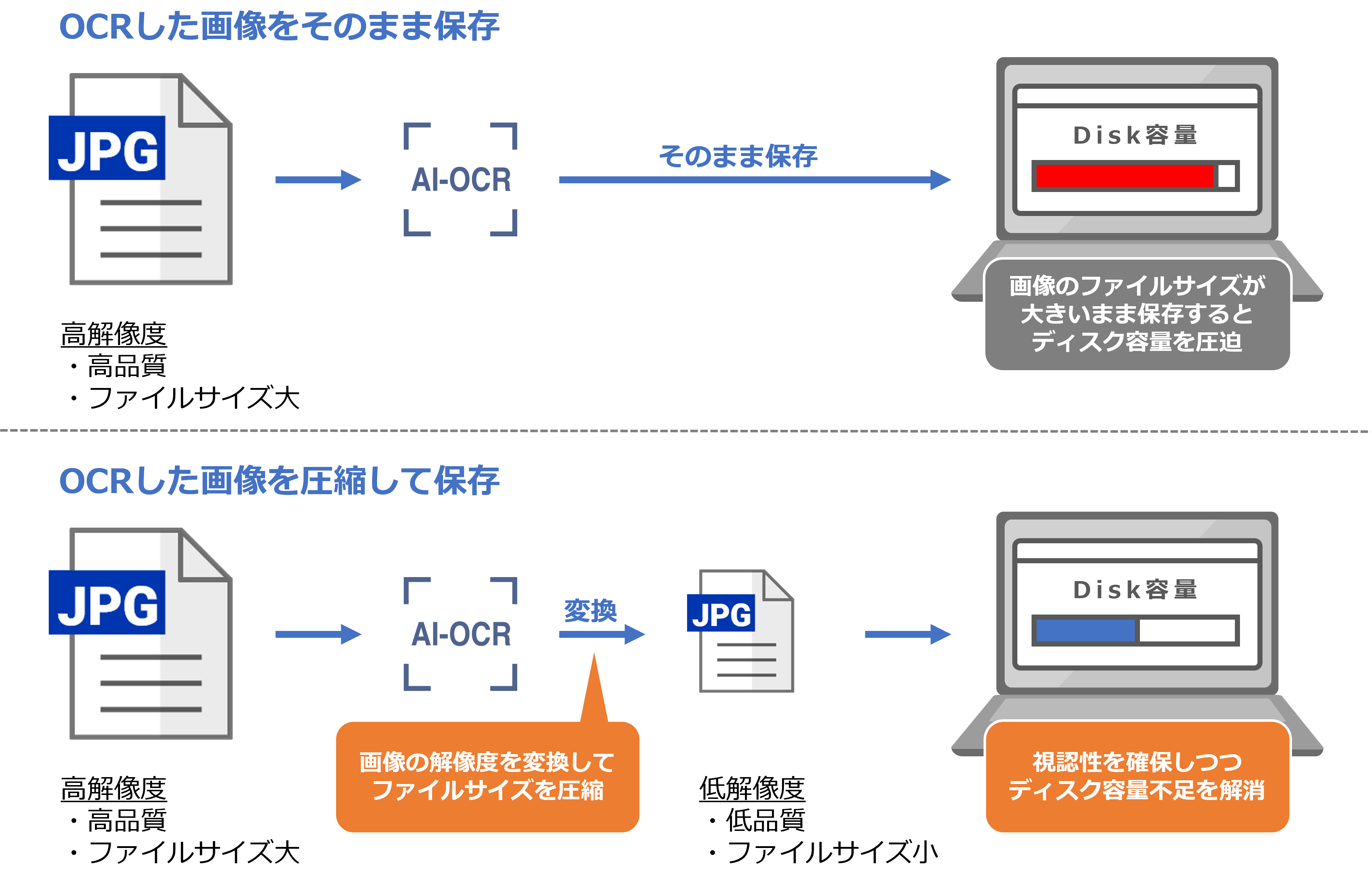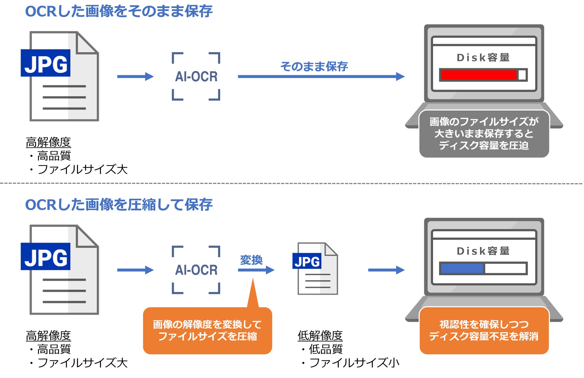 また、認識に使用した画像ファイルを低解像度に変換して保存する機能を新たに搭載。認識に最適な高解像度のまま画像を保存すると、ファイルサイズが大きく保存容量も大きくなるため、解像度を下げることでファイルサイズを小さくし、保存容量が不足するお悩みを解消します。