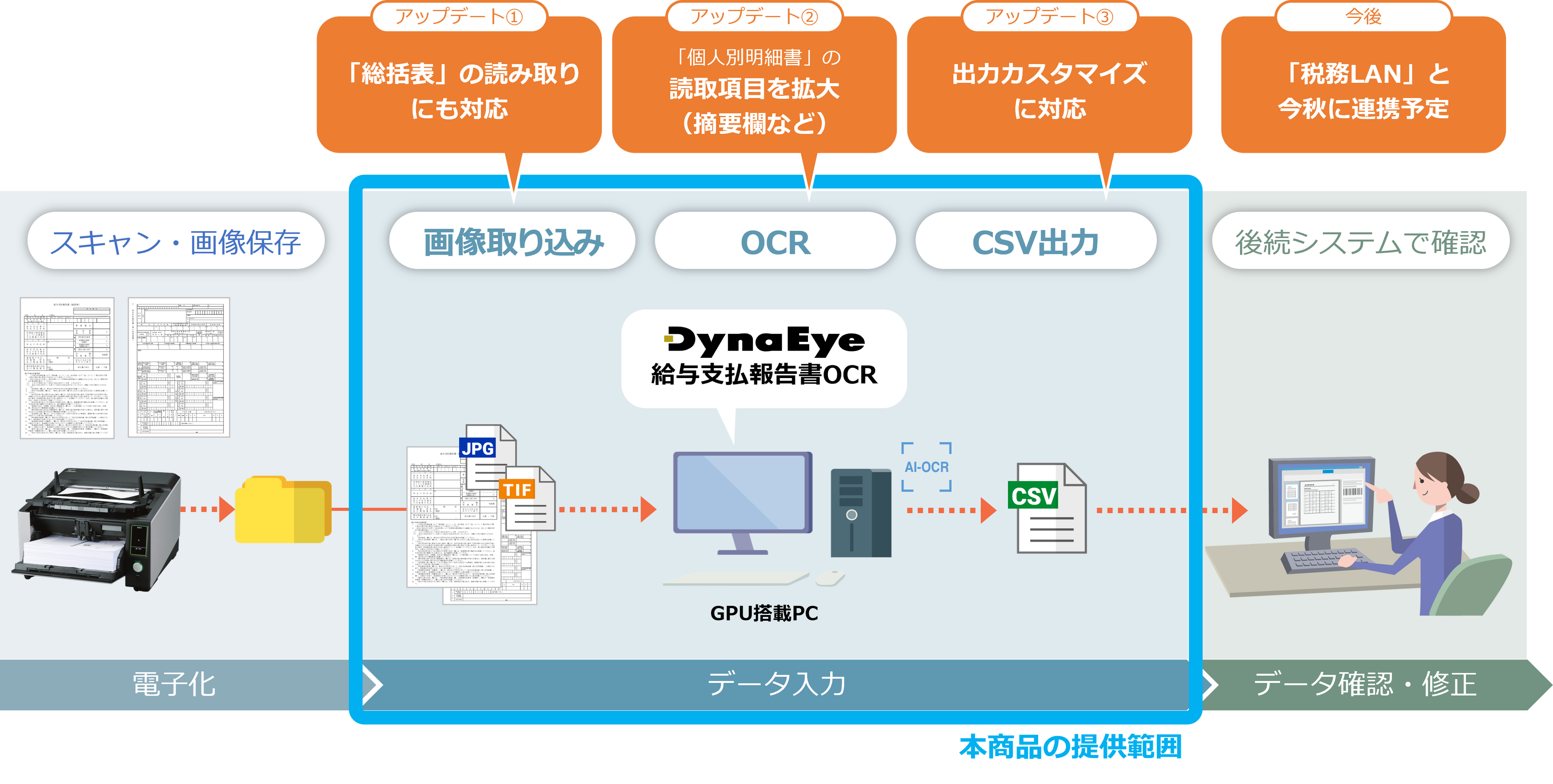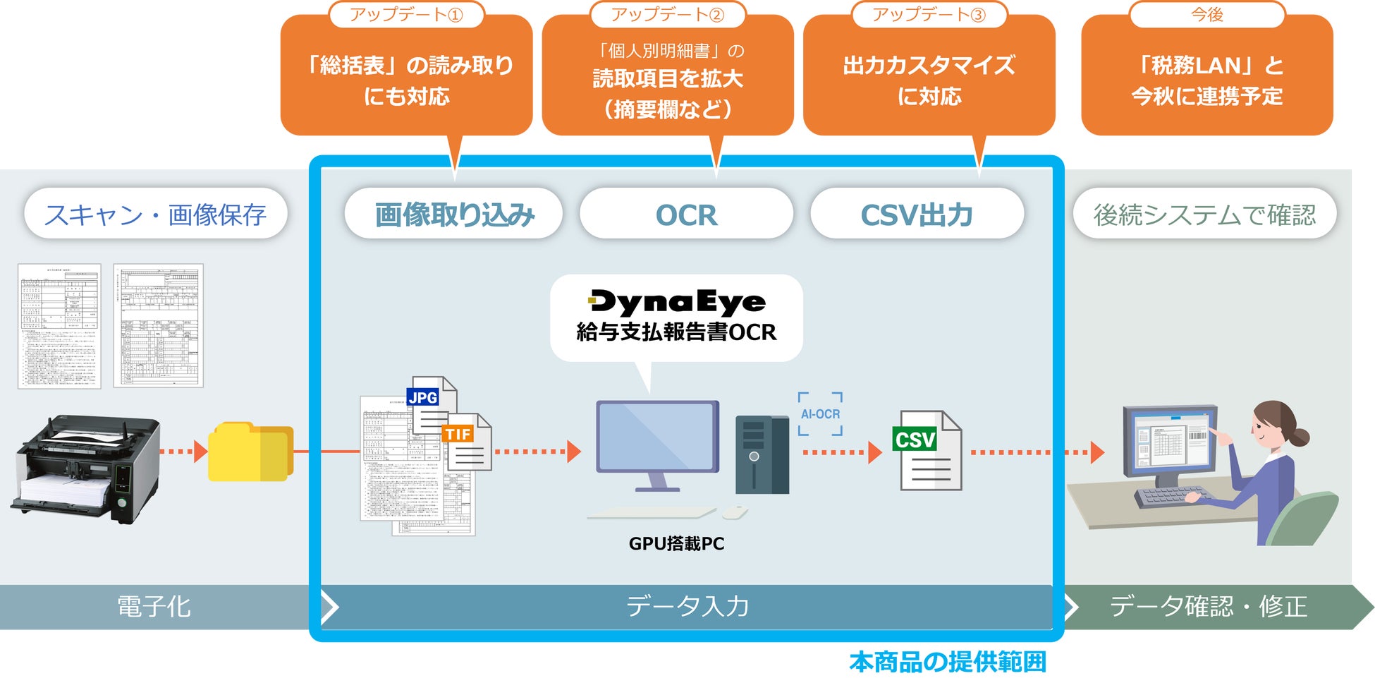 「DynaEye 給与支払報告書OCR」は、今後、給与支払報告書のデータ入力に対応した業務システムと連携し、AI-OCRをご利用いただけるようになります。