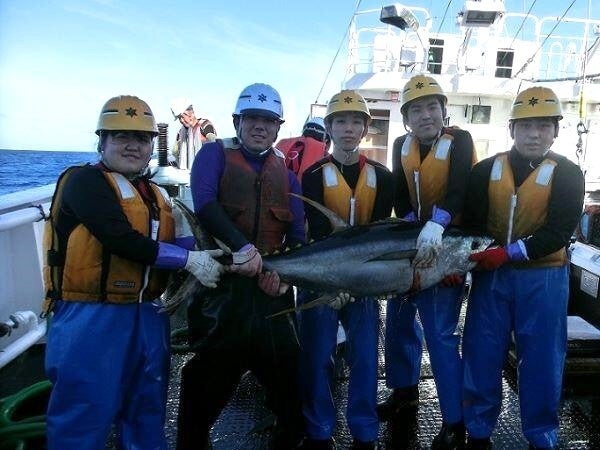 福島県立小名浜海星高校実習船”福島丸”で高校生が、約50日間を船上で過ごし、遠くハワイ沖にて漁獲してきたメバチマグロです。