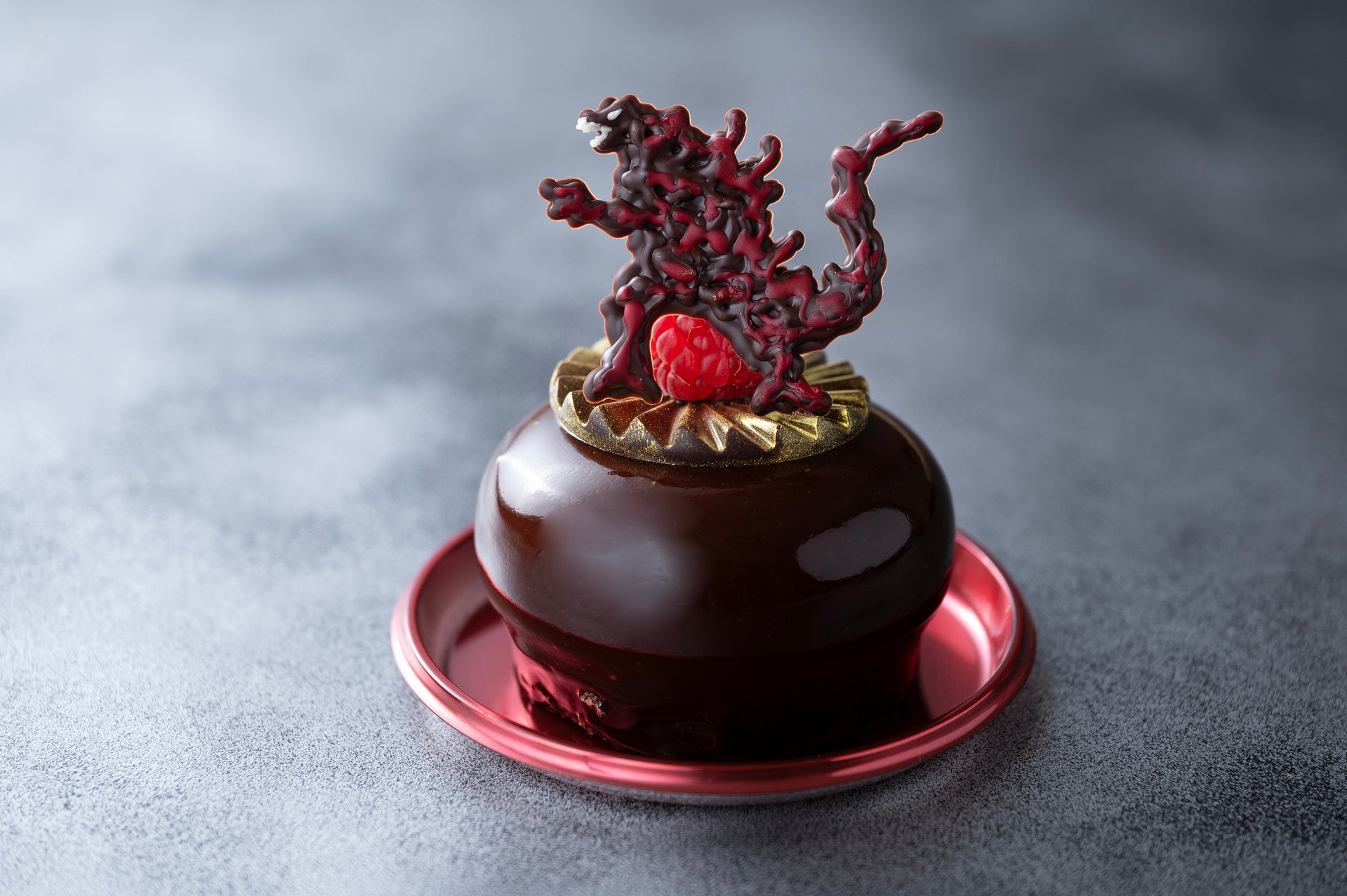 ミルクチョコレートの中に、生キャラメルとキャラメルクリームを閉じ込め、ゴジラのチョコレートをのせました。