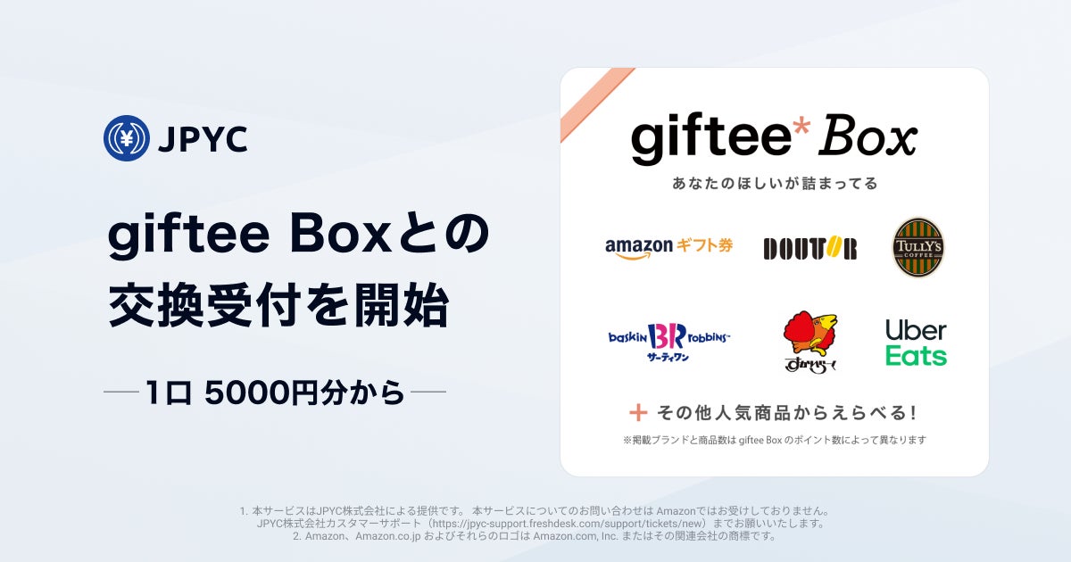 日本円ステーブルコインJPYC、giftee Boxとの交換受付を開始~1口5000円分から~