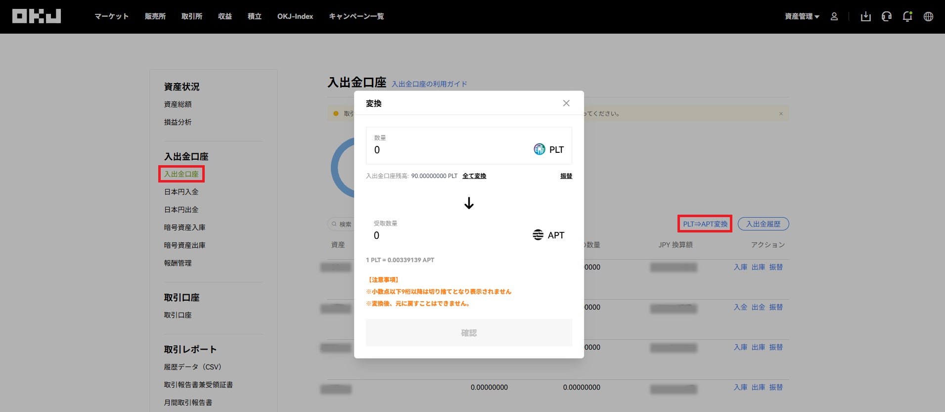 ※注意事項:PLTの変換にはOKJの口座が必要です。新規口座開設はこちら。小数点以下9桁以降は切り捨てとなり表示させれません。変換後、元に戻すことはできません。