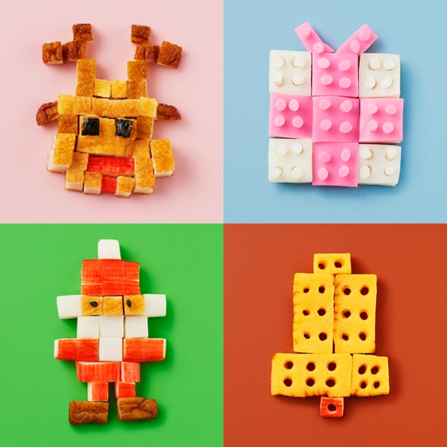 今回は、「ピクセルアートトナカイ」や「ブロックギフトボックス」など、練り製品をスクエアにカットし、ピクセルアート(ドット絵)風のオーナメントやブロックのようなクリスマスグッズを表現しました。お子さまと一緒にキッチンバサミやストローを使って型取りするのも楽しいですね!クリスマスメニューを華やかに彩ること間違いなしの“ねりデコ”です。