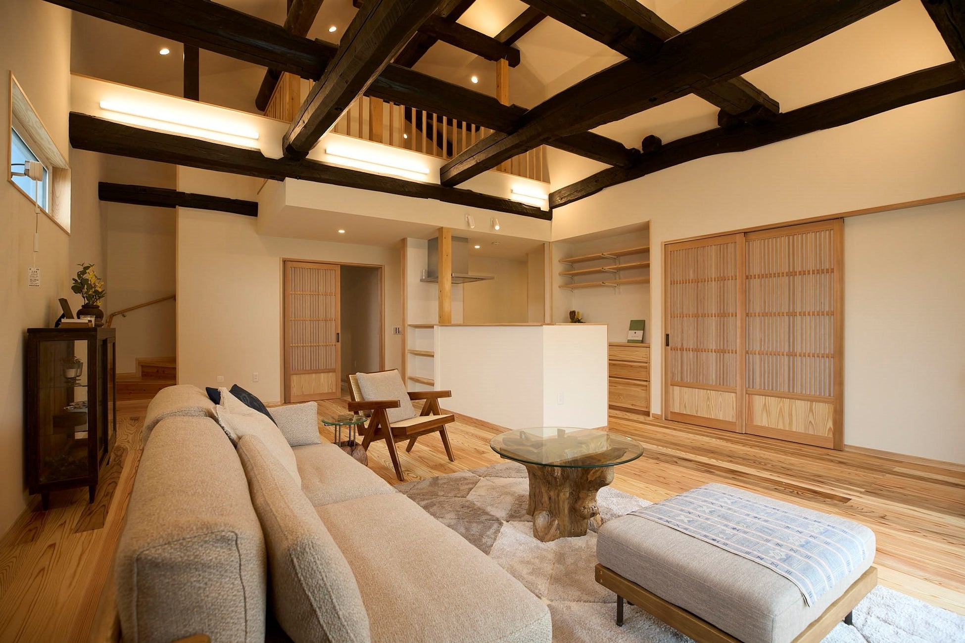 リビングでは、この住まいの象徴である約160年もの時を重ねた古材の梁が見守ります。最高天井高5m超の吹き抜けが広がる24.5帖のLDKは、家族時間の中心に。