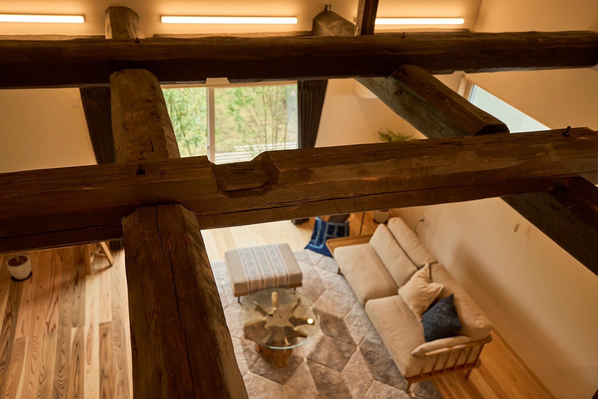 長い時を刻んだ古材を再生し、現代の住まいに息吹を与えます。家を中心で支える梁は、約160年もの歳月を重ねた古材。雪深い新潟県阿賀町で、暮らしを支え続けた良質な古材です。素材や風景に宿る記憶を大切にし、次の世代へ語り継ぐ暮らし方。 過去と未来をつなぐ、古くて新しい暮らし方を提案します。