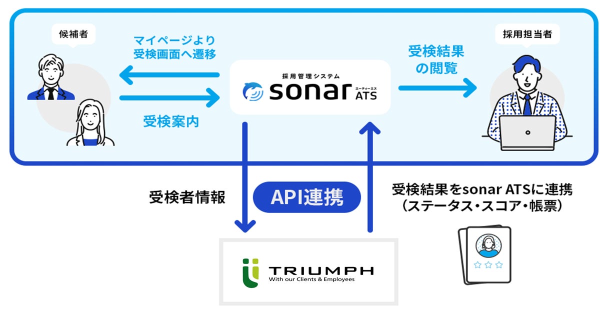 採用管理システム「sonar ATS」(ソナーエーティーエス)と、HRサービスのマーケットプレイス「sonar store」(ソナーストア)を提供するThinkings株式会社(シンキングス、本社:東京都中央区、代表取締役社長:吉田 崇)は、株式会社トライアンフ(本社:東京都渋谷区、代表取締役:樋口 弘和)が提供する適性検査「CUBIC TRIUMPH ver.」とAPI連携を開始します。これにより、これまで別々に管理されていた候補者情報と受検結果が、「sonar ATS」上で一元管理できるようになります。