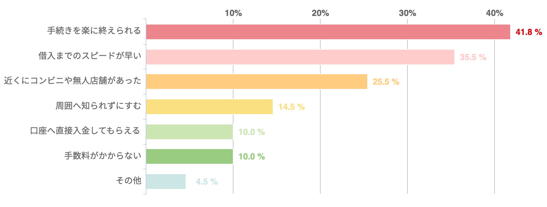 また、「借入までのスピードが早い(35.5%)」、「近くにコンビニや無人店舗があった(25.5%)」といった理由も一定数の回答があった。