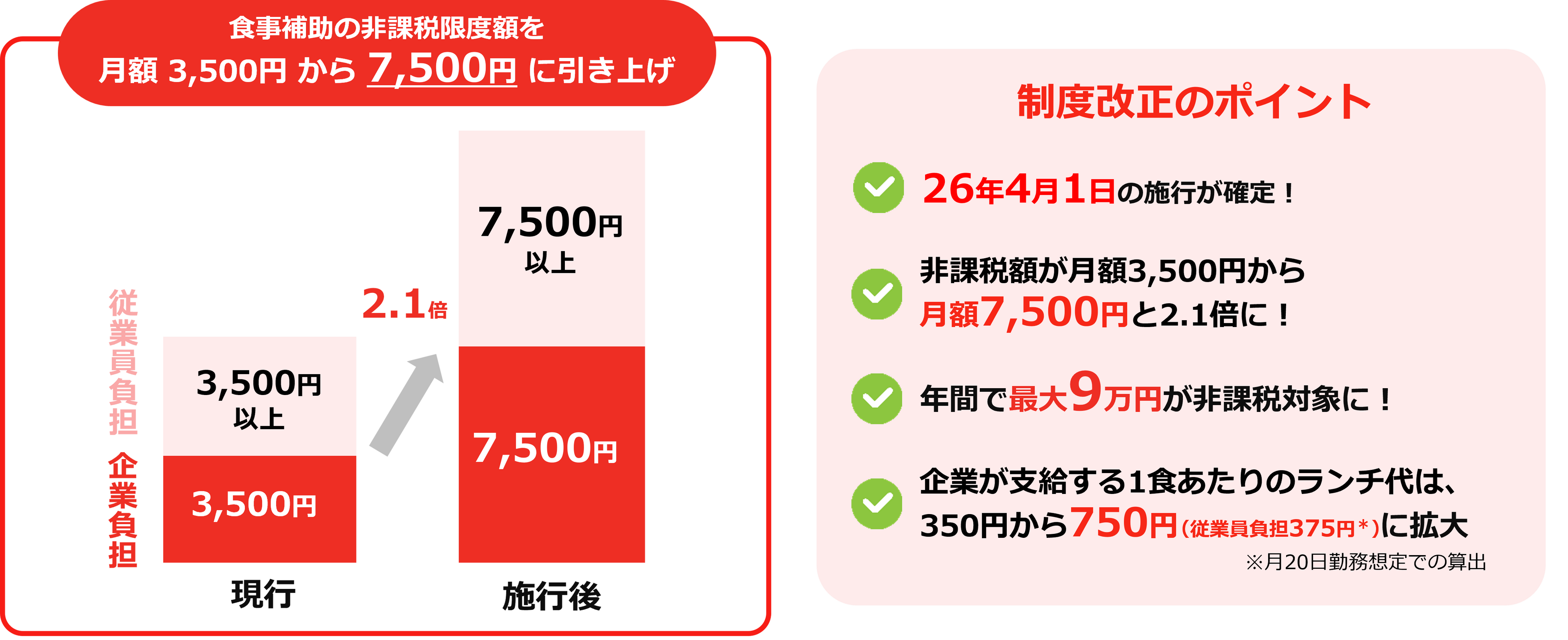 現在、長引く物価高騰や深刻な人手不足は、働く世代の家計と企業の人材獲得の双方に大きな影を落としています。こうした社会背景の中、2026年4月1日より、食事補助制度における非課税限度額が月額3,500円から7,500円へと約42年ぶりに倍増となる歴史的な税制改正が施行されました。