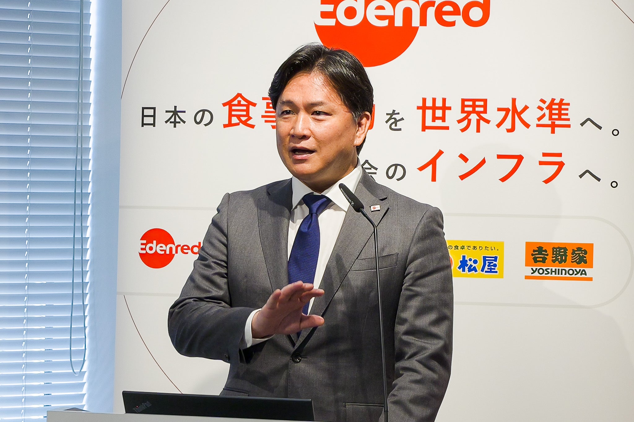 加盟店を代表し、株式会社松屋フーズホールディングス ITソリューション部 部長 今野慎一郎氏が登壇し、「昨今の物価上昇がみなさまのお食事にも大きな影響を及ぼしているであろうことを、日々、感じておりました。そんな折に『食を通じて、働く人を応援したい。食事補助を社会のインフラとしてひろげていきたい』という、エデンレッドさんの熱いポリシーをお伺いしまして、大変共感した」と取り組みへの参画経緯について説明。