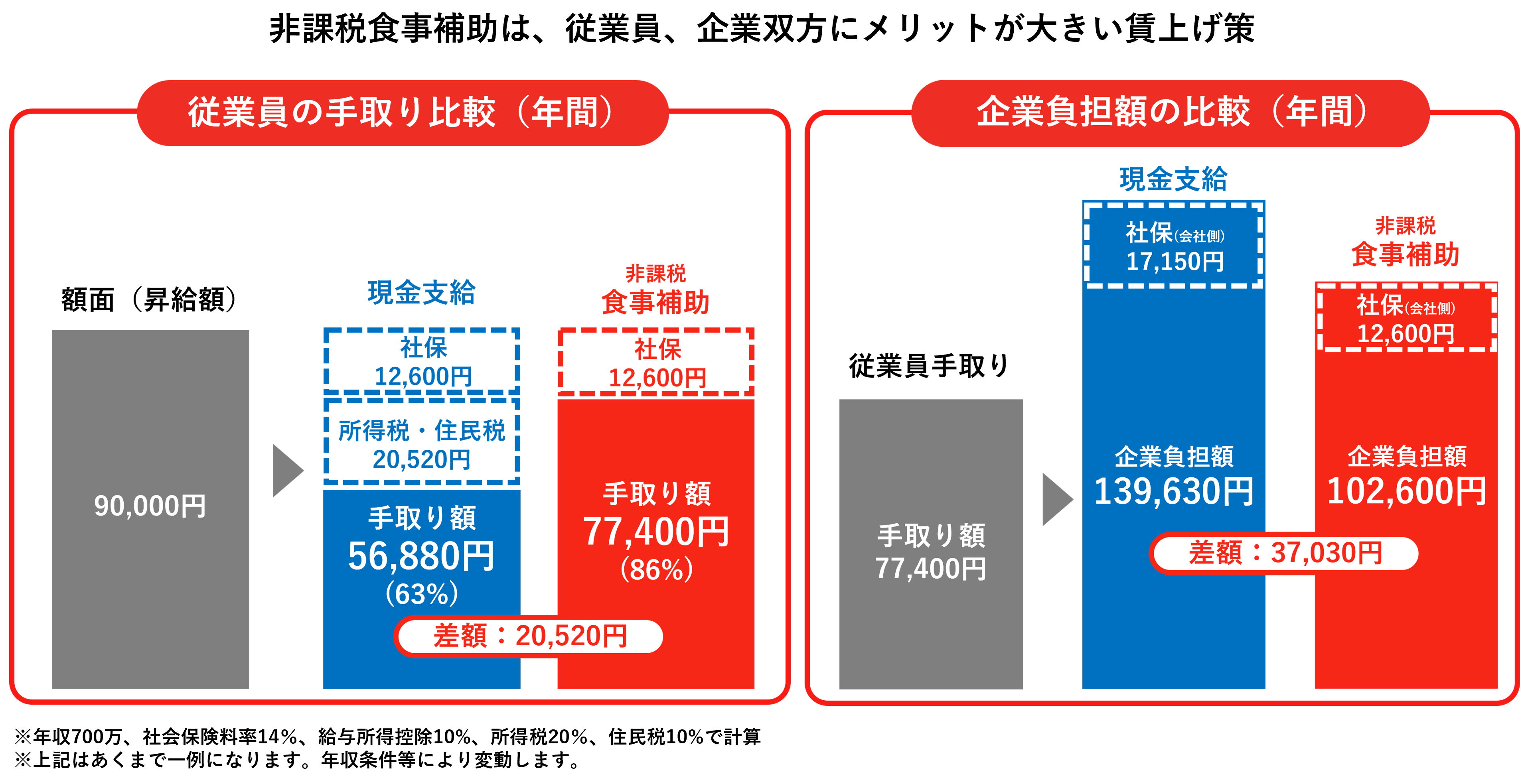 ①食事補助の非課税枠を活用し、従業員の税負担軽減による実質手取りアップを実現!