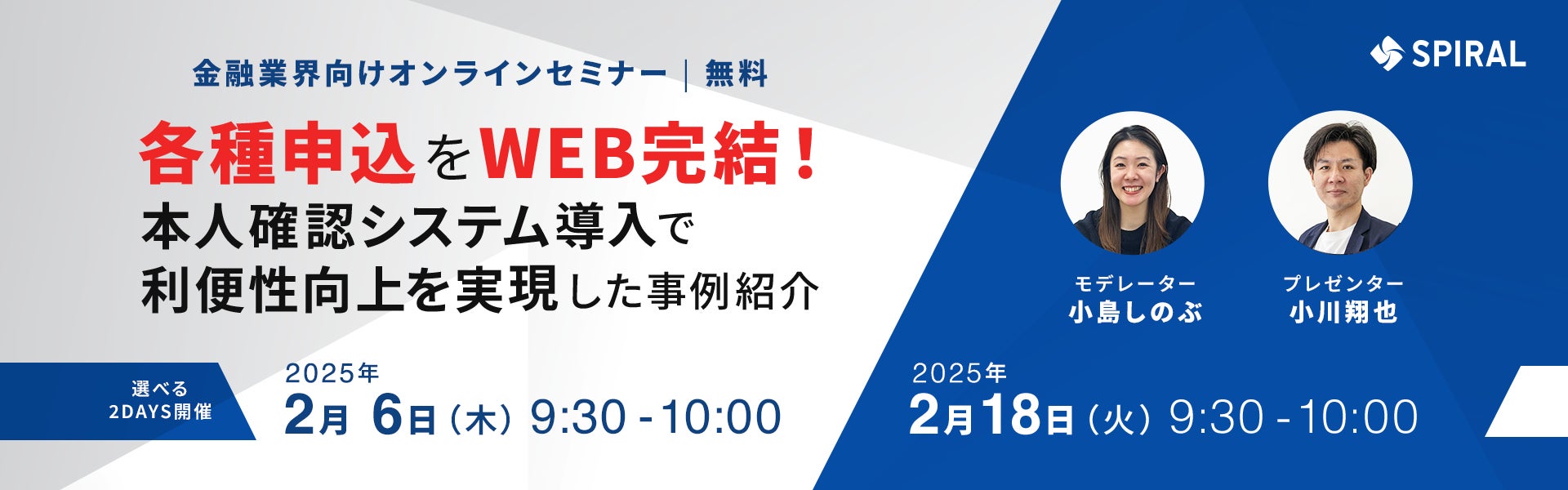 デジタルで未来最適をリードするスパイラル株式会社(東京都港区、代表取締役 CEO 佐谷 宣昭)は、金融機関向けオンラインセミナー「各種申込をWEB完結!本人確認システム導入で利便性向上を実現した事例紹介」を2025年2月6日(木)、18日(火)に開催いたします。