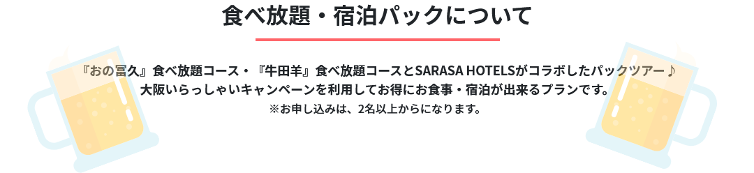 『おの冨久』食べ放題コース・『牛田羊』食べ放題コースとSARASA HOTELSがコラボしたパックツアー♪大阪いらっしゃいキャンペーンを利用してお得にお食事・宿泊が出来るプランです。