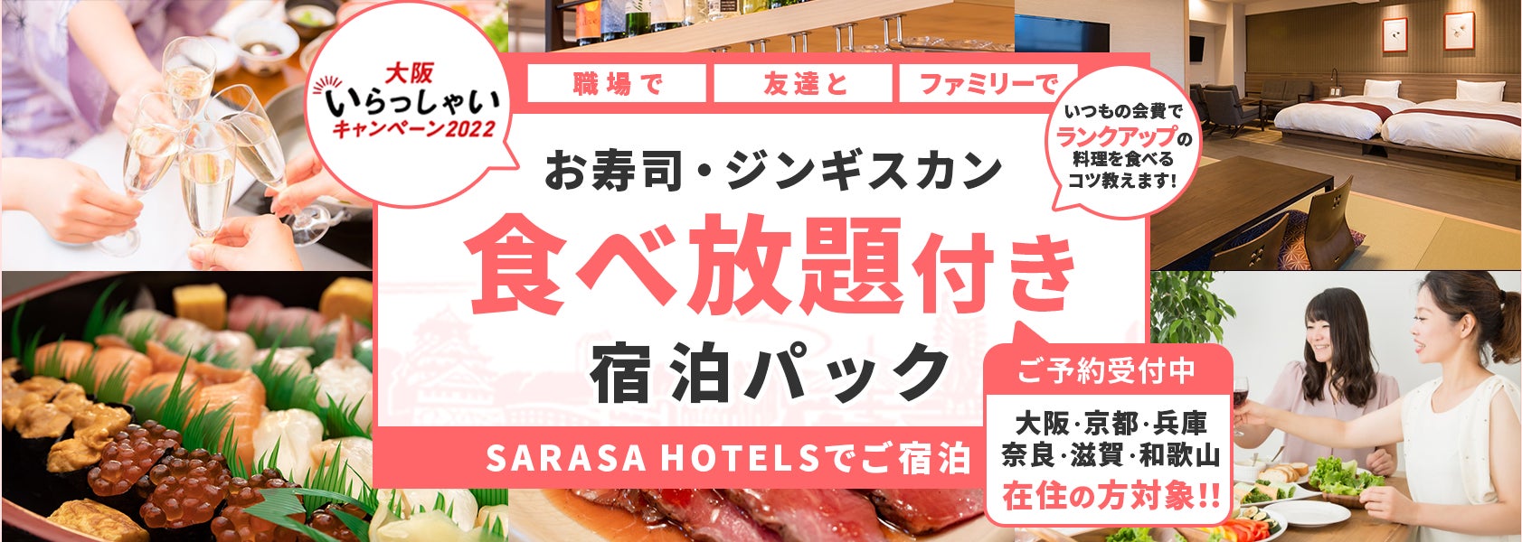 【7月14日迄延長!大阪府・京都府・兵庫県・奈良県在住の方限定!】7,000円 さらに2,000円クーポン付 お店で「お寿司」or「ジンギスカン食べ放題」付き「SARASA HOTEL」でご宿泊パック