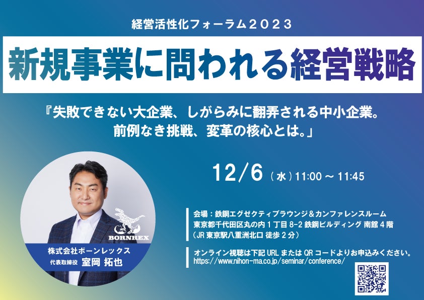※経営者必見※ビジネス環境の変化に適応し、成長を促進するためのイベント「経営活性化フォーラム2023」【12/6(水)11:00~11:45】にボーンレックス代表の室岡拓也が登壇します。