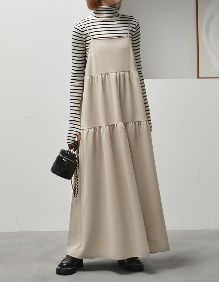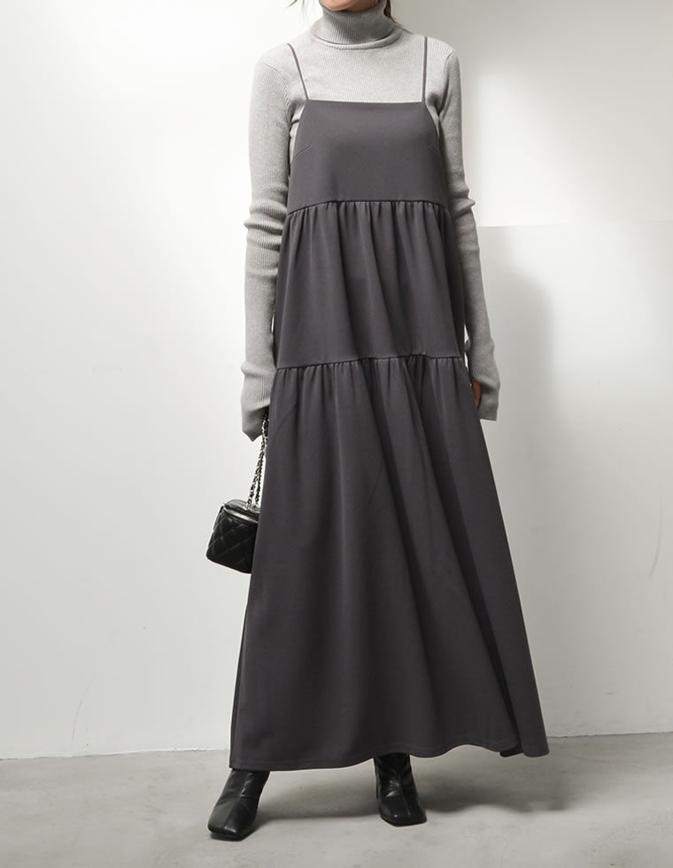 フロントはベアですっきりと、何段にもティアードデザインを施しトレンドライクに仕上げたワンピースです。