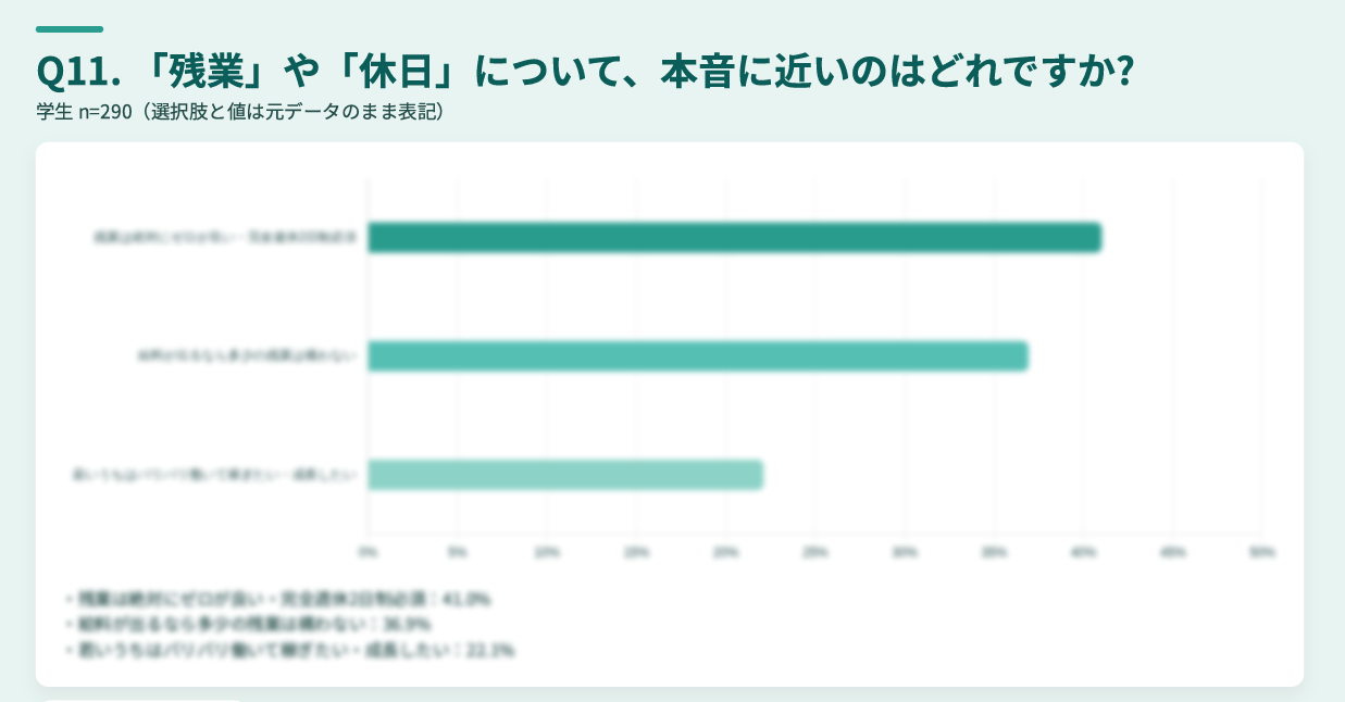 Q. 「残業」や「休日」について、本音に近いのはどれですか?