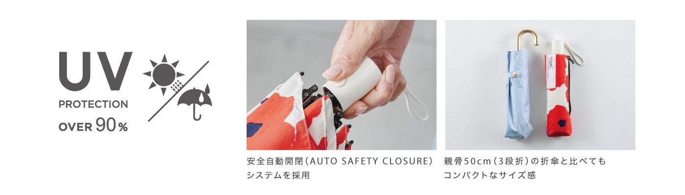 一般的な自動開閉式折りたたみ傘はシャフトを縮める際、一気に押し込まなければスプリングの力で押し戻されてしまいますが、Wpc.の傘は特殊な構造により、押し戻されることなく少しずつ段階的に収納できるので安全にお使いいただけます。