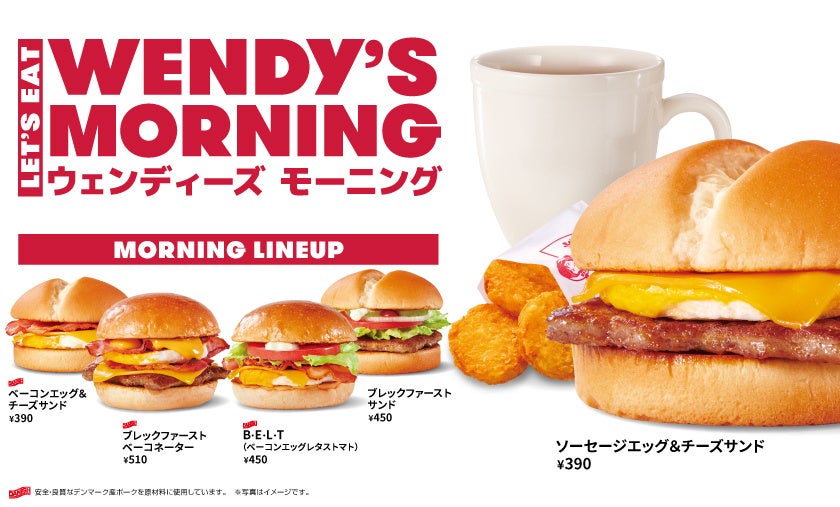 ウェンディーズ・ジャパン株式会社(代表取締役:紫関修 所在地:東京都新宿区)では、 1月26日(木)より、ウェンディーズ・ファーストキッチン店舗(一部店舗を除く)で、モーニングメニューをリニューアルします。今年はコロナ禍で4度目の春を迎えますが、出勤や通学の機会が徐々に増える中で、春を前にラインナップを充実させます。新商品 B・E・L・T 「ベルト」 は、 カリカリに焼き上げたベーコンとエッグ、フレッシュなレタスとトマト、濃厚なチェダーチーズを組み合わせ、具だくさんで食べやすいホットサンドイッチに仕上げました。 また、モーニング限定で+190円(税込)でハッシュポテトとドリンク、+110円(税込)で ドリンクが付くお得なセットをご用意しています。ぜひ、ウェンディーズ・ファーストキッチンのお得なモーニングサービスをご利用ください!