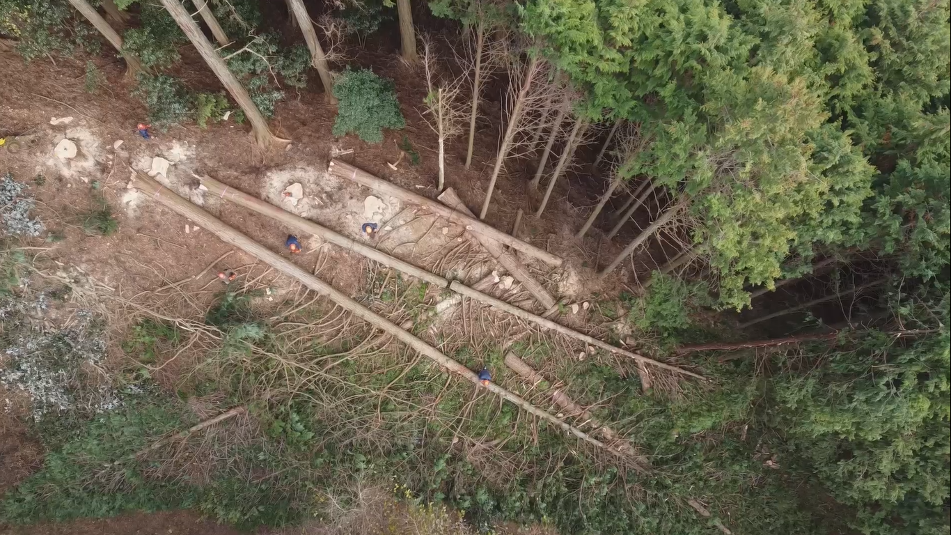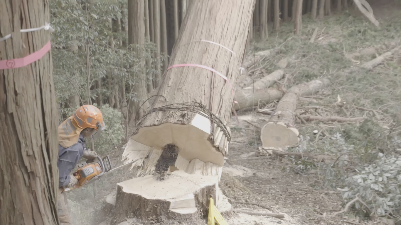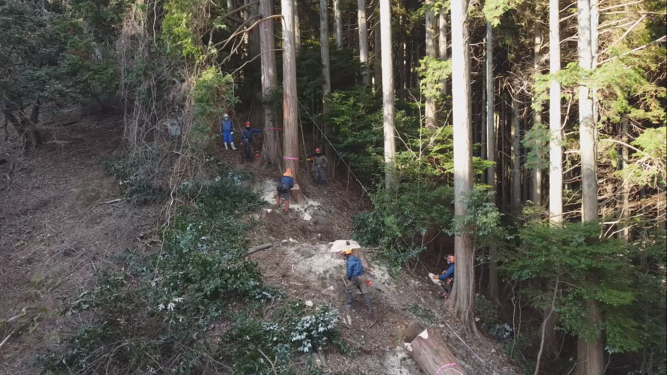 ※檜の伐採は,細心の注意を払って専門の事業者が実施。伐採後は,ヘリコプター等による運搬,乾燥など,木材として使用するまでに約2年程度を要します。