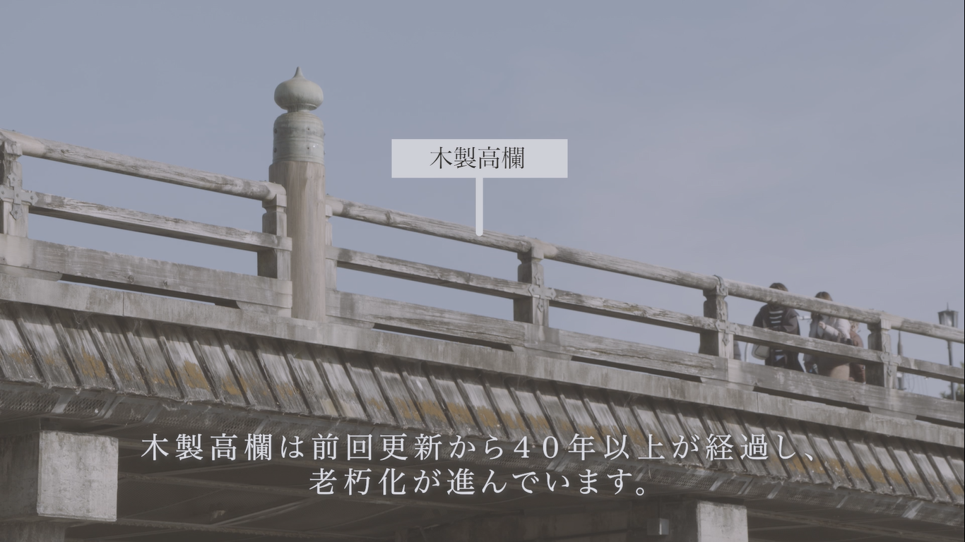 そこで,京都市では,三条大橋の美しい風景や木の文化を次世代に継承していくため,ふるさと納税を通じた皆様からの御寄付により,木製高欄の更新をはじめとした「三条大橋の補修・修景」に取り組んでいます(令和6年春完成予定)。