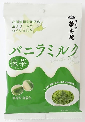 ・商品特長 :北海道根釧地区の生クリームと、甘く芳醇な香りが特長のマダガスカル産バニラビーンズを使用したバニラミルクの飴。「辻利一本店」の宇治抹茶を飴として限界量加えた抹茶飴。