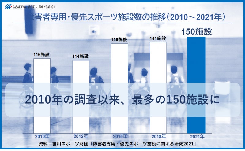 全国に150の障害者専用・優先スポーツ施設があることを発表しました(2021年6月発表)。施設数は、2010年:116、2012年:114、2015年:139、2018年:141と増加傾向にあります。