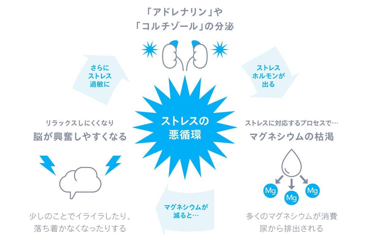 さらに、ストレスホルモンの影響でマグネシウムが尿として排出されやすくなるため、消費と排出の悪循環が生じ、さらに不足しやすい状態になります。