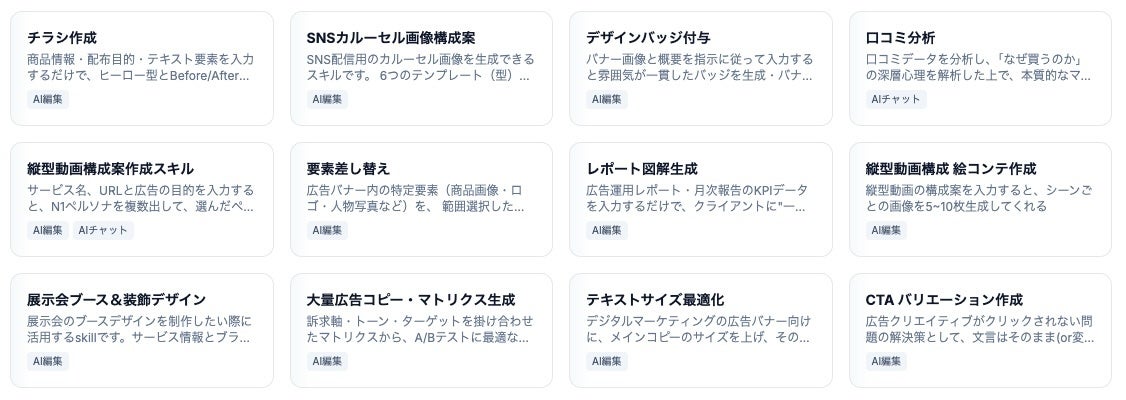 My Skills(ユーザー開発):自社のトンマナ、制作ルール、業界知識などをスキルとして開発し、AIエージェントに追加。チームの暗黙知を形にして品質を標準化可能