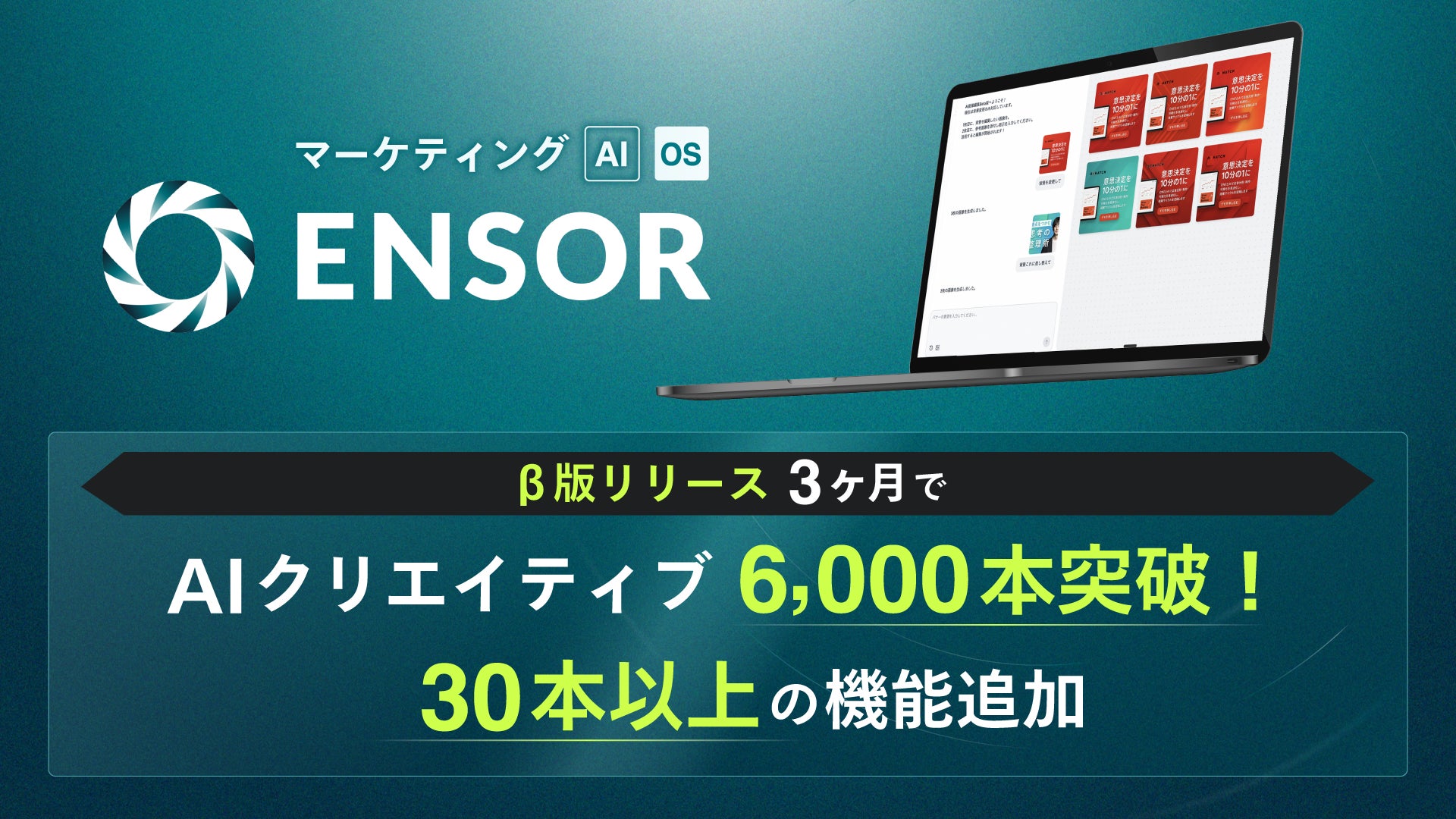 マーケティングAI OS「ENSOR」、β版リリース3ヶ月でAI生成クリエイティブ6,000本突破 ── 30本以上の機能で広告・LP・データ分析まで一気通貫で