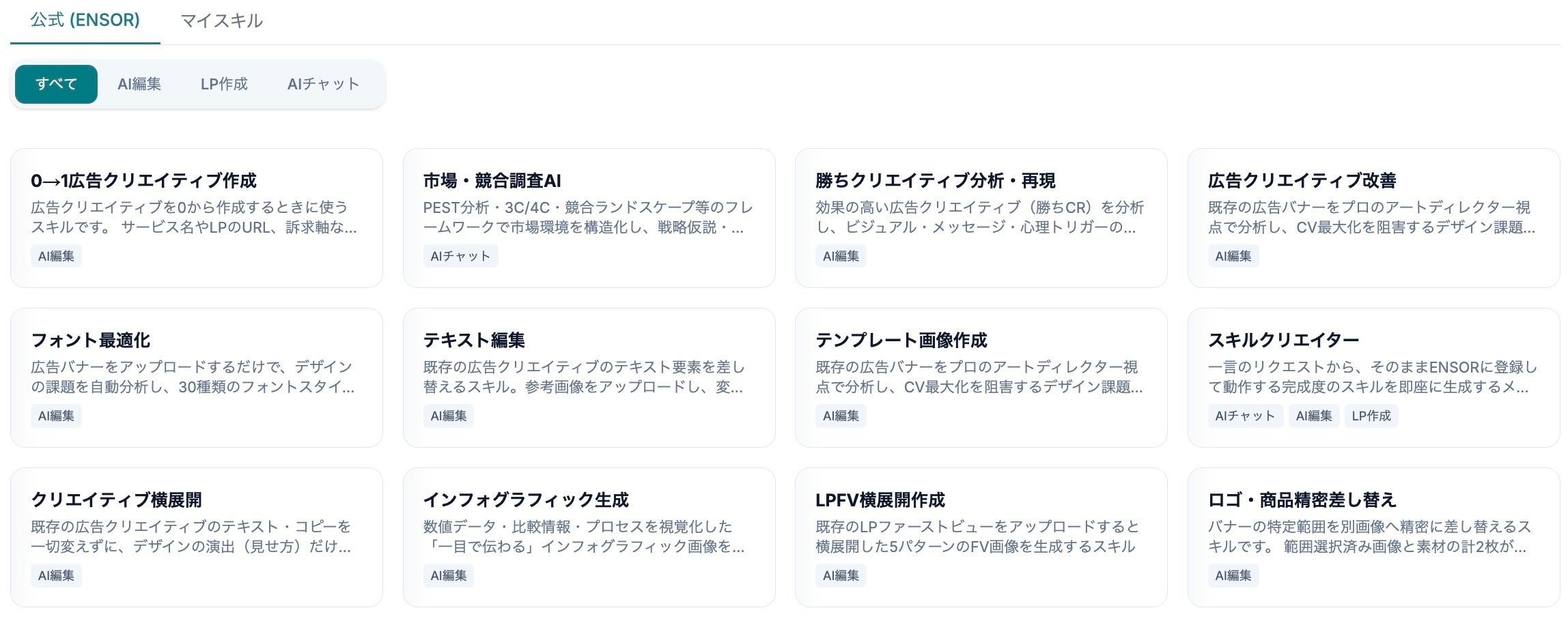 ENSORは「学び続けるマーケティングOS|勝ちバナー量産AI」をコンセプトに、クライアント独自のブランド・パフォーマンスデータを学習し、広告バナー・LP・SNS用画像などを自動生成するプラットフォームです。