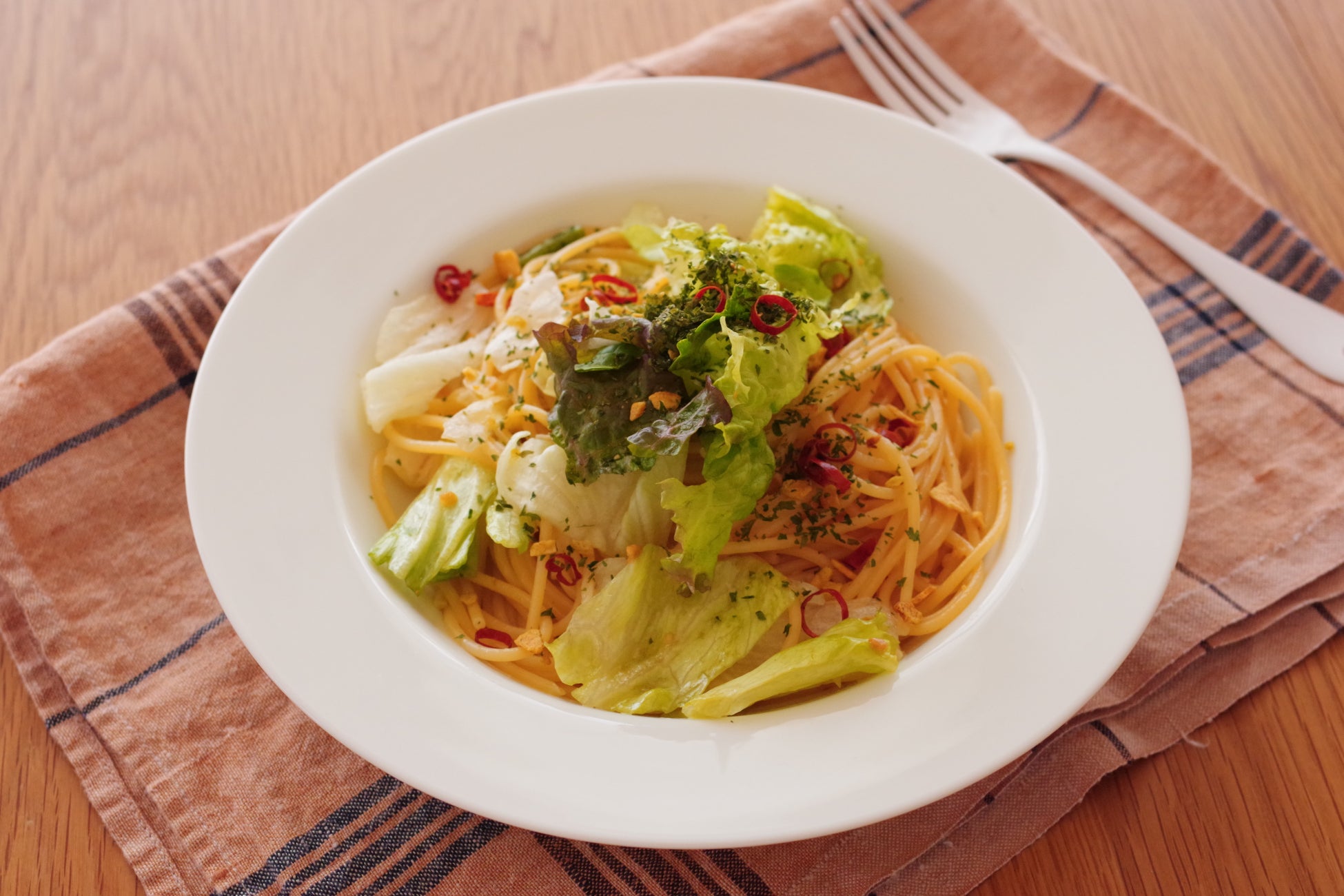 シンプルなペペロンチーノにふわふわしゃきしゃきのレタスを加えます。サラダも兼ねられる一皿になります。