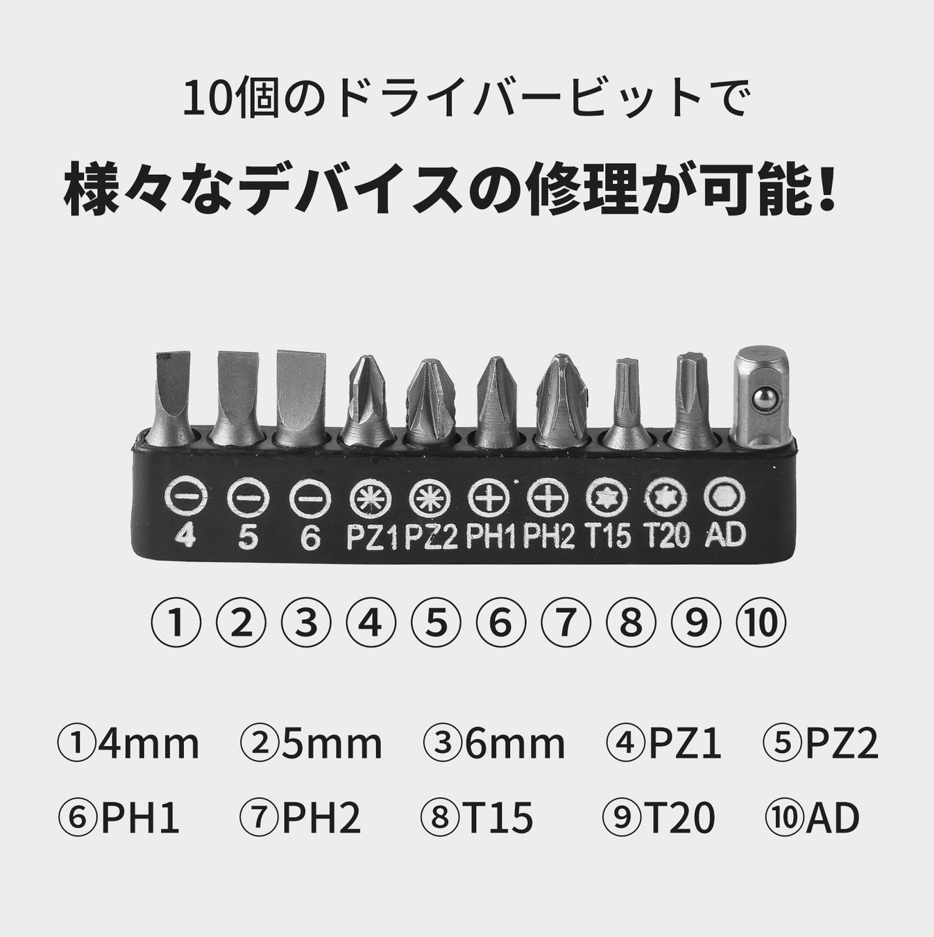 AD:アダプタビット 異なる種類のビットを変換するためのビットです。さまざまなネジ形状に対応でき、便利で多用途に使用できます。