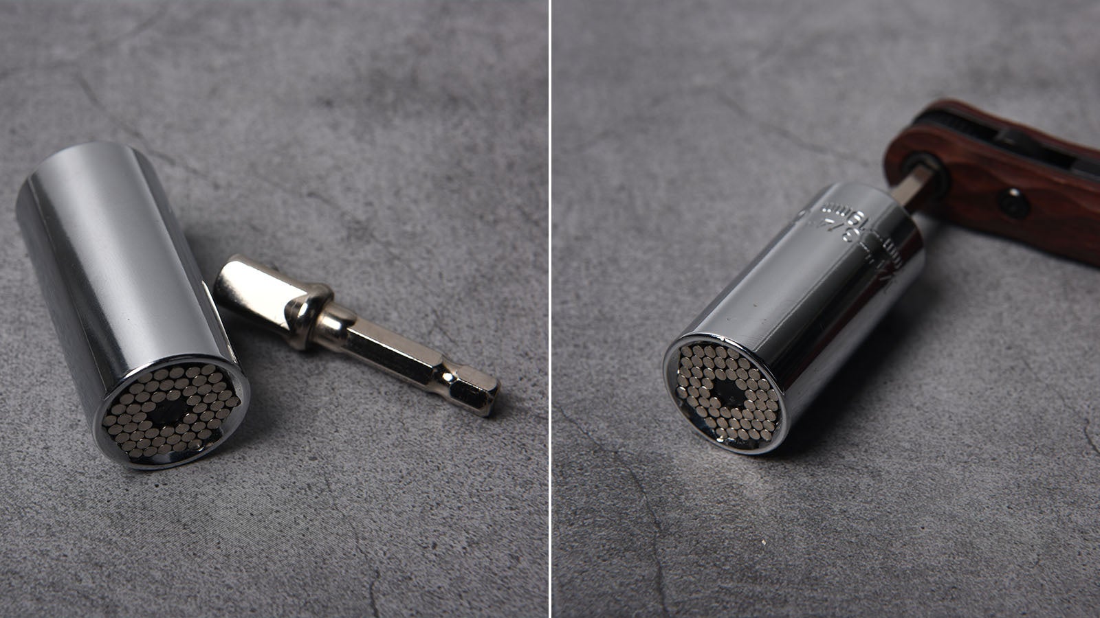 重厚感に比例したマグネットの強力吸引で、安定感はおどろくほど抜群!ドライバーもレンチもブレることなく、快適に作業をすることが可能です。本体を逆さまにしてもこの通り。落としてしまって紛失することもありません!