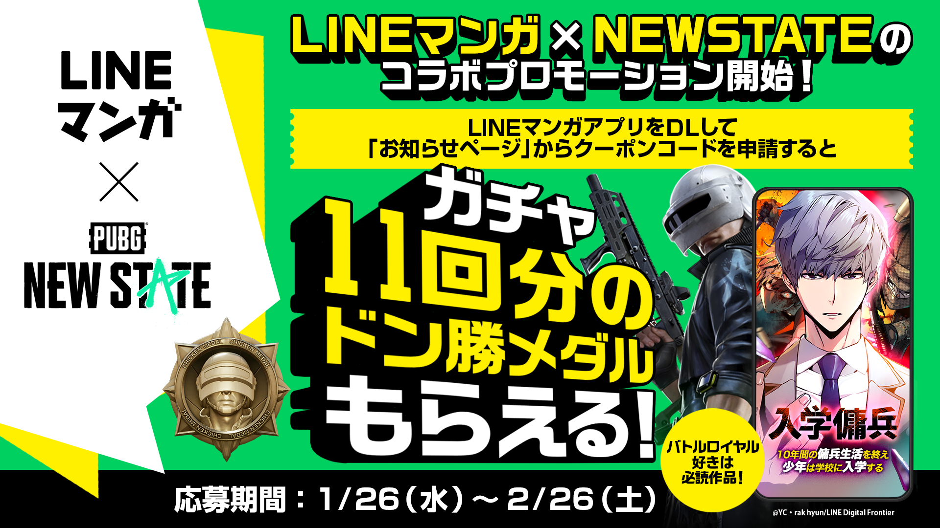 内容: 『LINEマンガ』アプリ内「運営からのお知らせ」より申請すると、 『PUBG: NEW STATE』 の11連ガチャ相当分である「ドン勝メダル30個」を無料プレゼント。