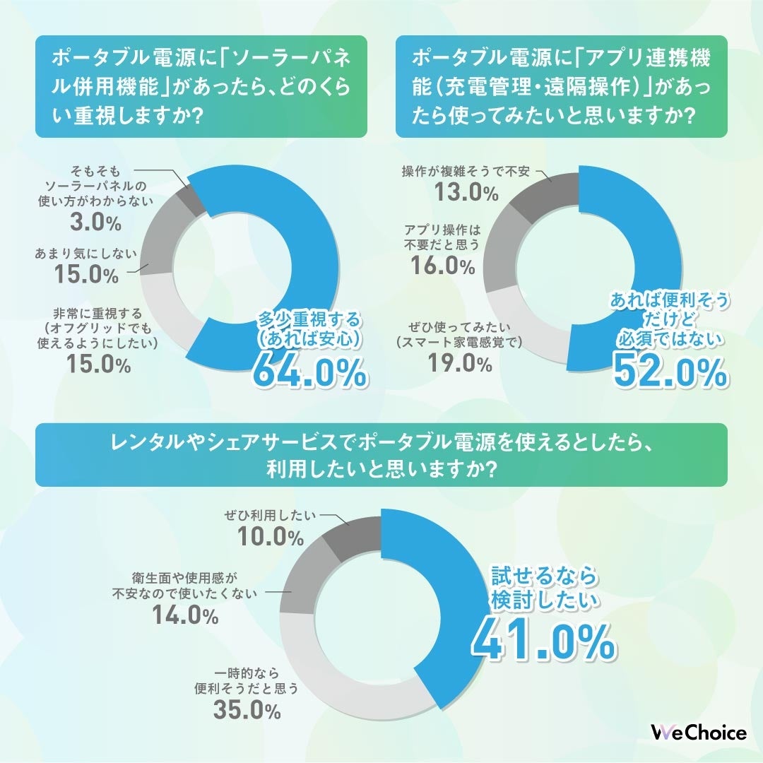 【「ソーラーパネル併用機能」がある場合、どのくらい重視しますか?/アプリ連携機能(充電管理・遠隔操作)があったら使ってみたいと思いますか?/レンタルやシェアサービスでポータブル電源を使えるとしたら、利用したいと思いますか?】