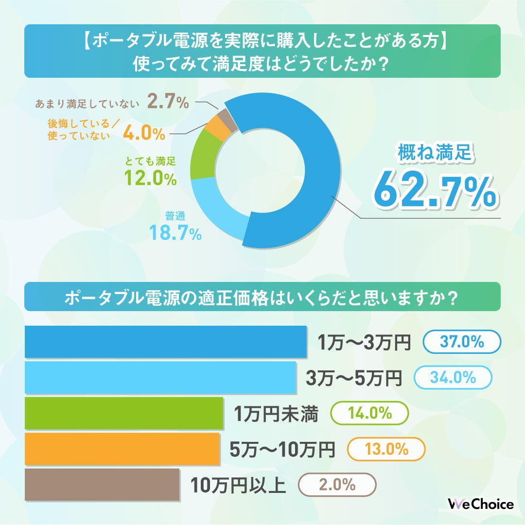 適正価格としては「1万〜3万円」と答えた方が最も多く、コスパを重視する傾向がうかがえます。選ぶ際には、用途に合った容量や出力、安全性、信頼できるメーカーかどうかなど、総合的にチェックすることがポイントです。