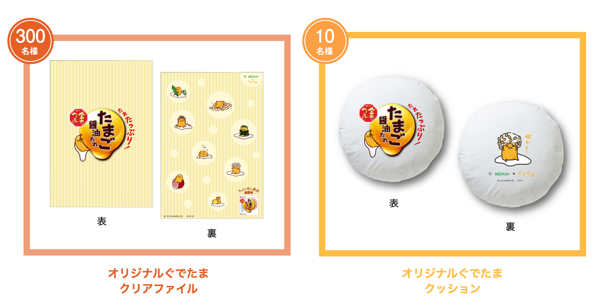 ぐでたまとコラボした、ミツカン「金のつぶ® たれたっぷり!たまご醤油たれ」と相性ぴったりな8種類の"ちょい足し"具材の中から、食べてみたい「推しの具材」を選んで投票してください。キャンペーン期間中に、投票&結果をTwitterでシェアしてくれた方の中から、抽選で300名様に「オリジナルぐでたまクリアファイル」、また、1位に選ばれた「推しの具材」に投票&結果をTwitterでシェアしてくれた方の中から、抽選で10名様に「オリジナルぐでたまクッション」をプレゼントいたします。