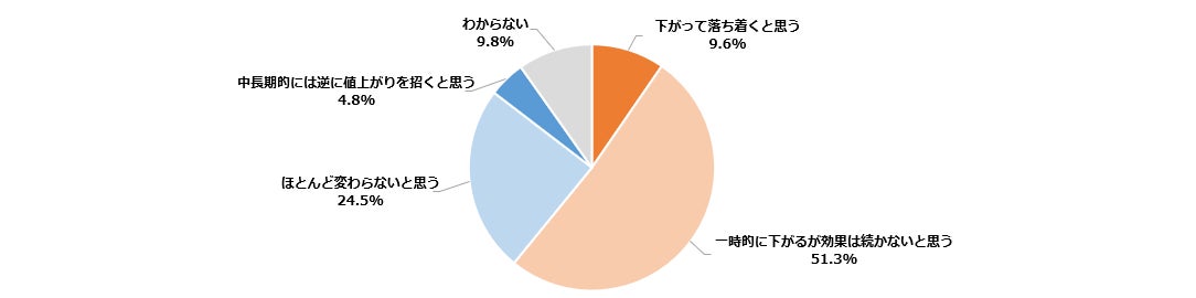 政府による一連の備蓄米放出でコメの販売価格が今後どうなると思うか聞くと「一時的に下がるが効果は続かないと思う」が51.3%で最多となり、「ほとんど変わらないと思う」24.5%、「下がって落ち着くと思う」9.6%、「長期的には逆に値上がりを招くと思う」4.8%だった。「わからない」は9.8%。