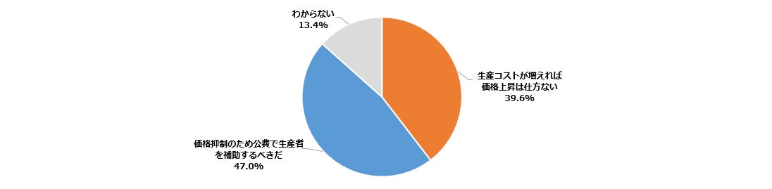 燃料や肥料などの価格高騰を踏まえ、コメの販売価格について、「生産コストが増えれば上昇するのは仕方ないと思う」を選んだ人は39.6%、「抑制するために公費で生産者を補助するべきだと思う」とした人は47.0%となった。