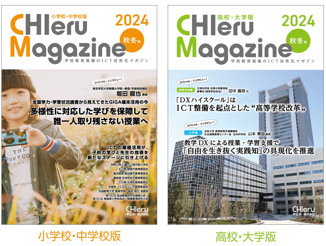 学校教育向けのICT利活用を支援するチエル株式会社(本社:東京都品川区、代表取締役社長:粟田 輝)は2024年9月17日(火)、“学校教育現場のICT活性化マガジン”とご好評いただいている『CHIeru Magazine(チエルマガジン)』2024秋冬号を刊行し、全国の教職員や学校関係者に無料で配布することをお知らせいたします。