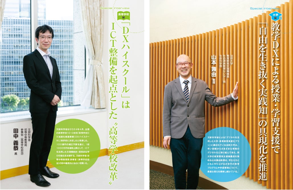 高校・大学版では、文部科学省 初等中等教育局 参事官(高等学校担当)の田中 義恭氏と、法政大学 教育開発支援機構長 社会連携教育センター長 生命科学部 山本兼由 教授の両名を巻頭スペシャルインタビューとして取材させていただきました。