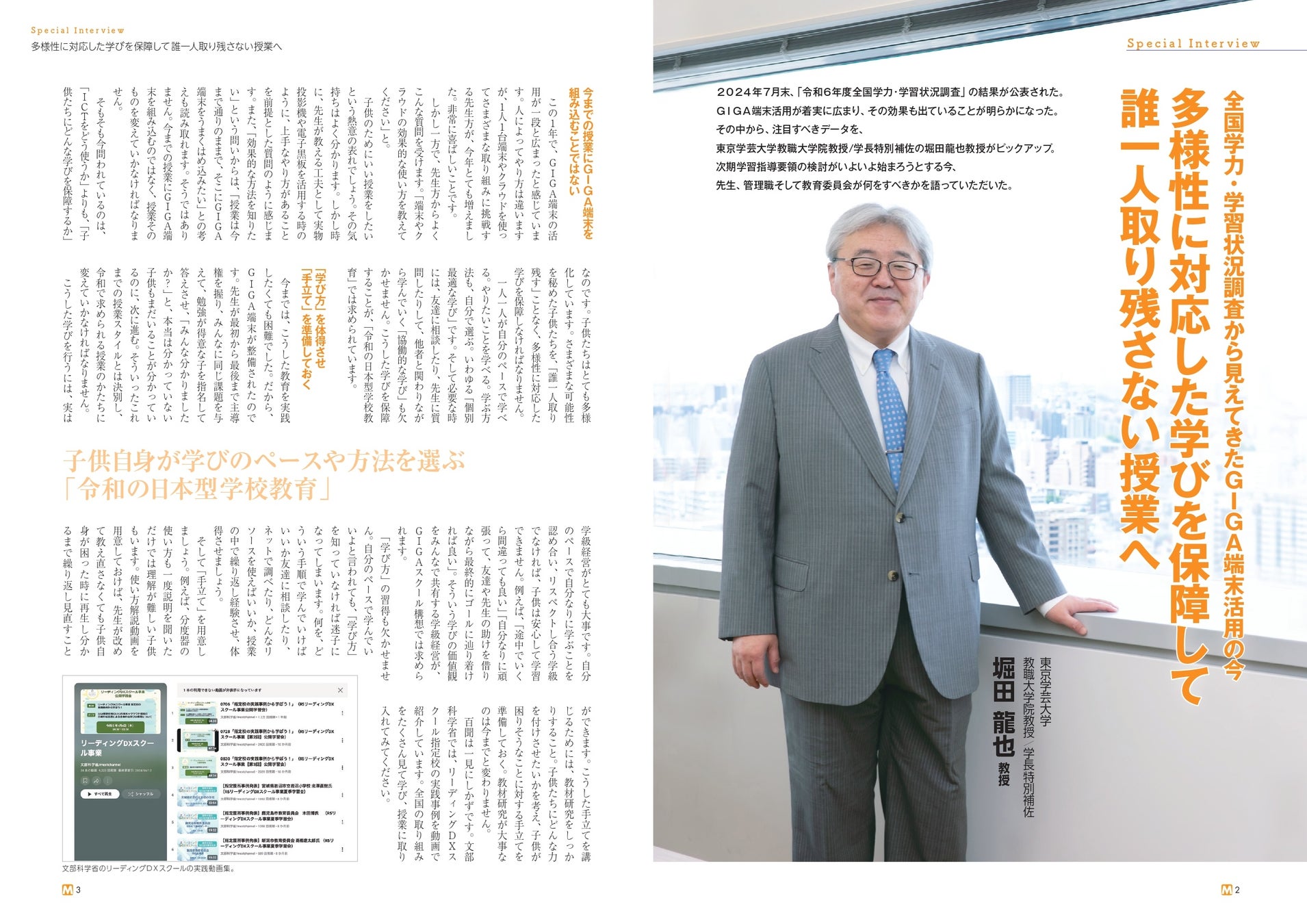 巻頭スペシャルインタビューでは、東京学芸大学教職大学院/学長特別補佐の堀田龍也教授が全国学力・学習状況調査の結果から見えてきたGIGA端末活用について語られました。「さまざまな可能性を秘めた子供たちを『誰一人取り残す』ことなく、多様性に対応した学びを保障しなければなりません」と、授業そのものを変えていかなければならないことを指摘されております。次期学習指導要領の検討が始まろうとしてる今、先生や管理職、教育委員会が何をなすべきかを語っていただきました。