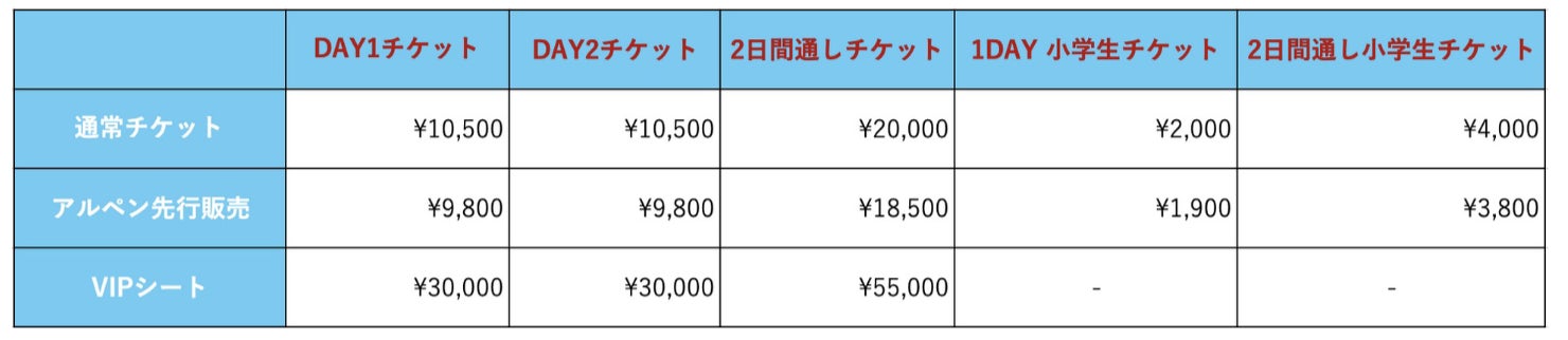 中学生以上:10,500 円/2 日間通し券 20,000 円