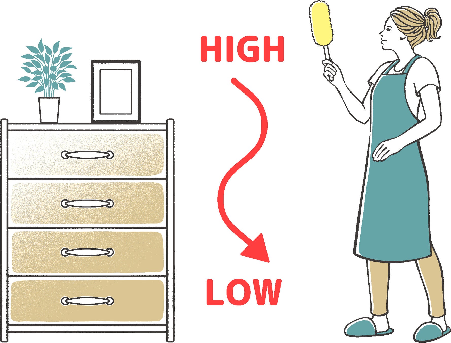 掃除は高い所から低い所へ進めるのが基本ですが、高い所を、はたきでパタパタと払ってしまうと、ハウスダストをまき散らしてしまいます。高い所はホコリを吸着するタイプのモップなどを使って静かになでて吸着させましょう。また、ハウスダストがたまりやすいのは、床や低い場所にある家電製品、家具など。毎日家じゅうをお掃除するのは大変なので、ハウスダストを減らす目的なら、ふだんの掃除は低い所を集中的に行いましょう。